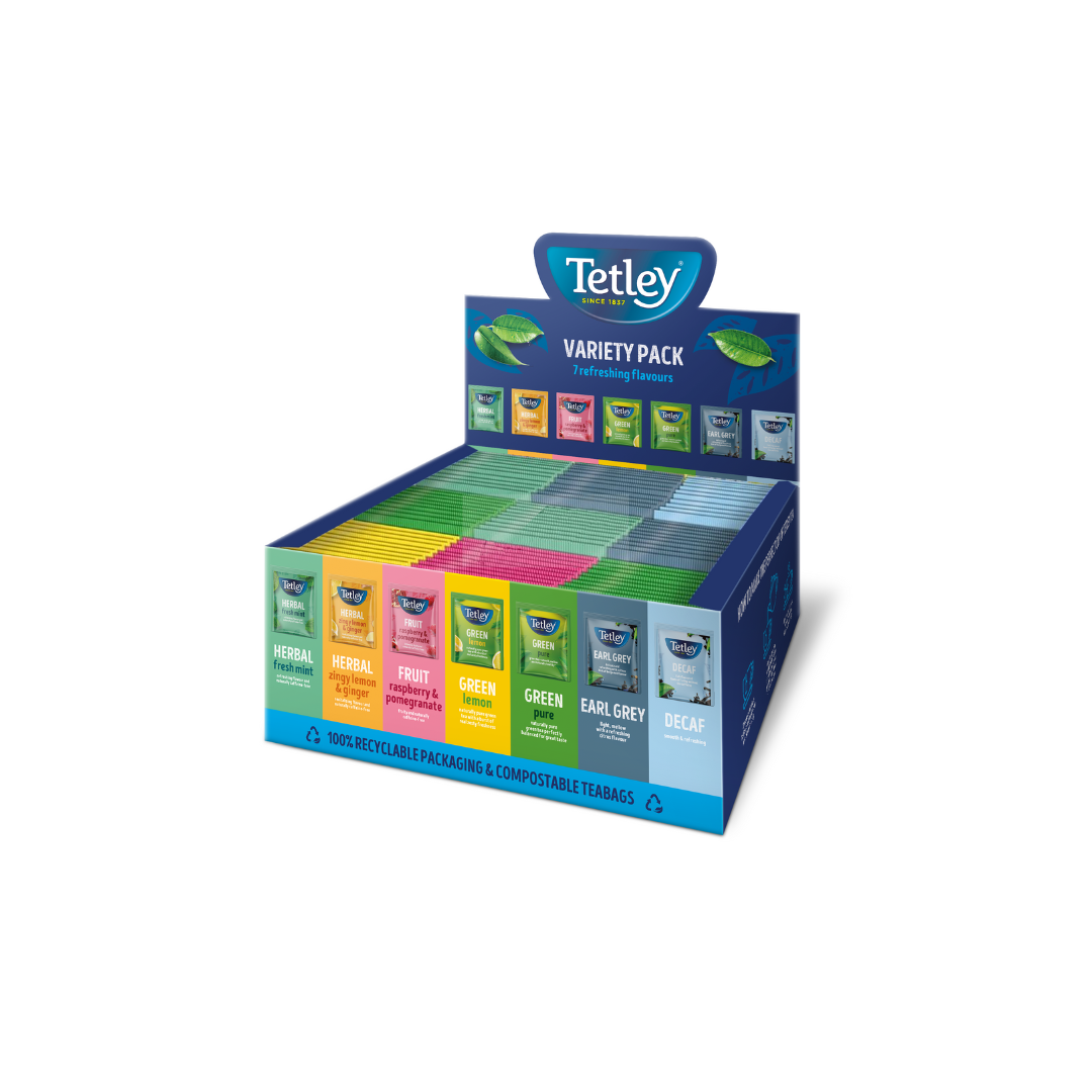 SEVEN FLAVOUR SPLASH – Mint Fusion coolness, berry-bright Raspberry-Pomegranate, two zesty greens, warming Lemon-Ginger, refined Earl Grey and mellow Decaf turn every tea break into a discovery tour.